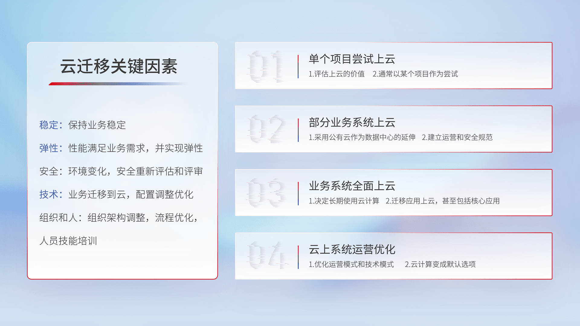 结合实际业务,,,从规划设计、、云平台选型、、、云原生改造、、、、数据迁移、、、集成交付,,,,迁移全过程为客户识别最佳上云路径,,做好风险识别管理,,,,设计网络架构、、、、身份权限、、、、安全审计合规、、、、操作审计、、、日志审计、、、监控告警策略、、、、多站点容灾设计等,,对云上基础设施进行整体规划,,提升IT治理水平,,,以满足弹性、、、、高可用、、、、高性能的需求。。。。