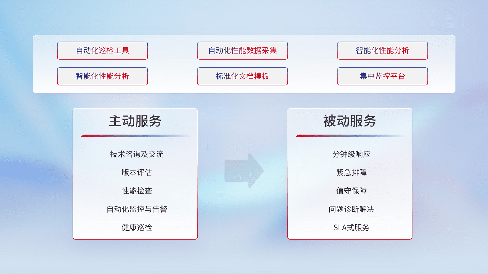 智能化工具和标准化文档,,保障服务质量,,,提供主动服务(包含技术咨询、、、、版本评估、、、性能检查、、、自动化监控与告警、、、、健康巡检)和被动服务包含(分钟级响应、、、、紧急排障、、、值守保障、、问题诊断解决、、、SLA服务)。。。。